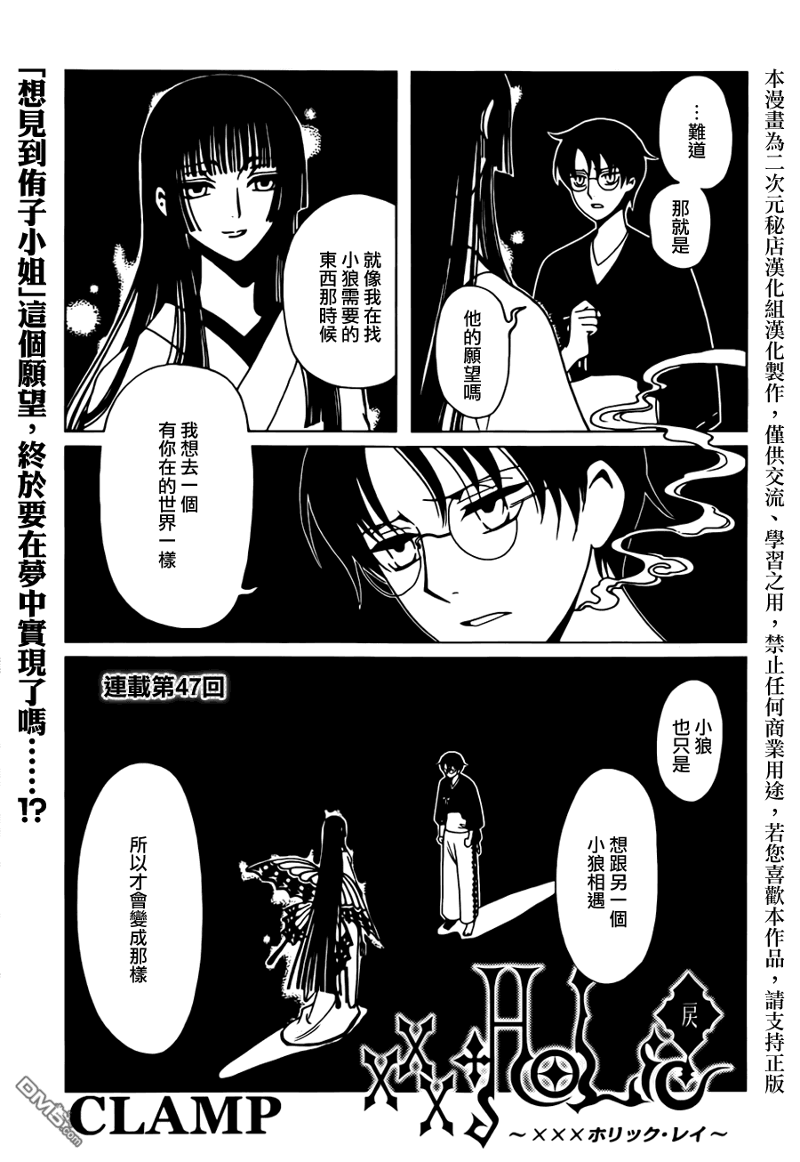 12 pages again for this chapter — 122 pages so far for volume 4. Next chapter will be out on March 28. By then, Nirai Kanai hen will have ended and maybe XXXHOLiC Rei’s pacing will run faster?