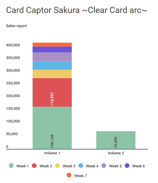 The second volume of Card Captor Sakura ~Clear Card arc~ debutted at the 7th position in Oricon’s weekly ranking, with an estimate of 70,099 copies sold in its first week of sales.