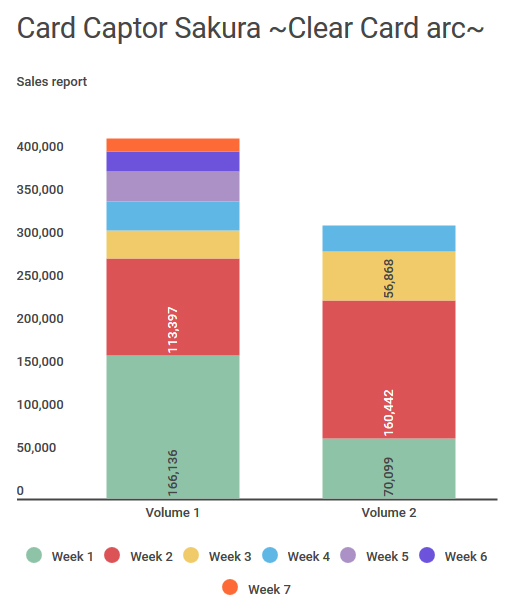 The chart below shows the progress in the sales of Card Captor Sakura ~Clear Card arc~ over the weeks and compares it with previous volumes’ performances (click on it for dynamic version):
