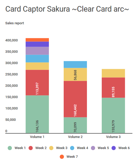 The chart below shows the progress in the sales of Card Captor Sakura ~Clear Card arc~ over the weeks and compares it with previous volumes’ performances (click on it for dynamic version):