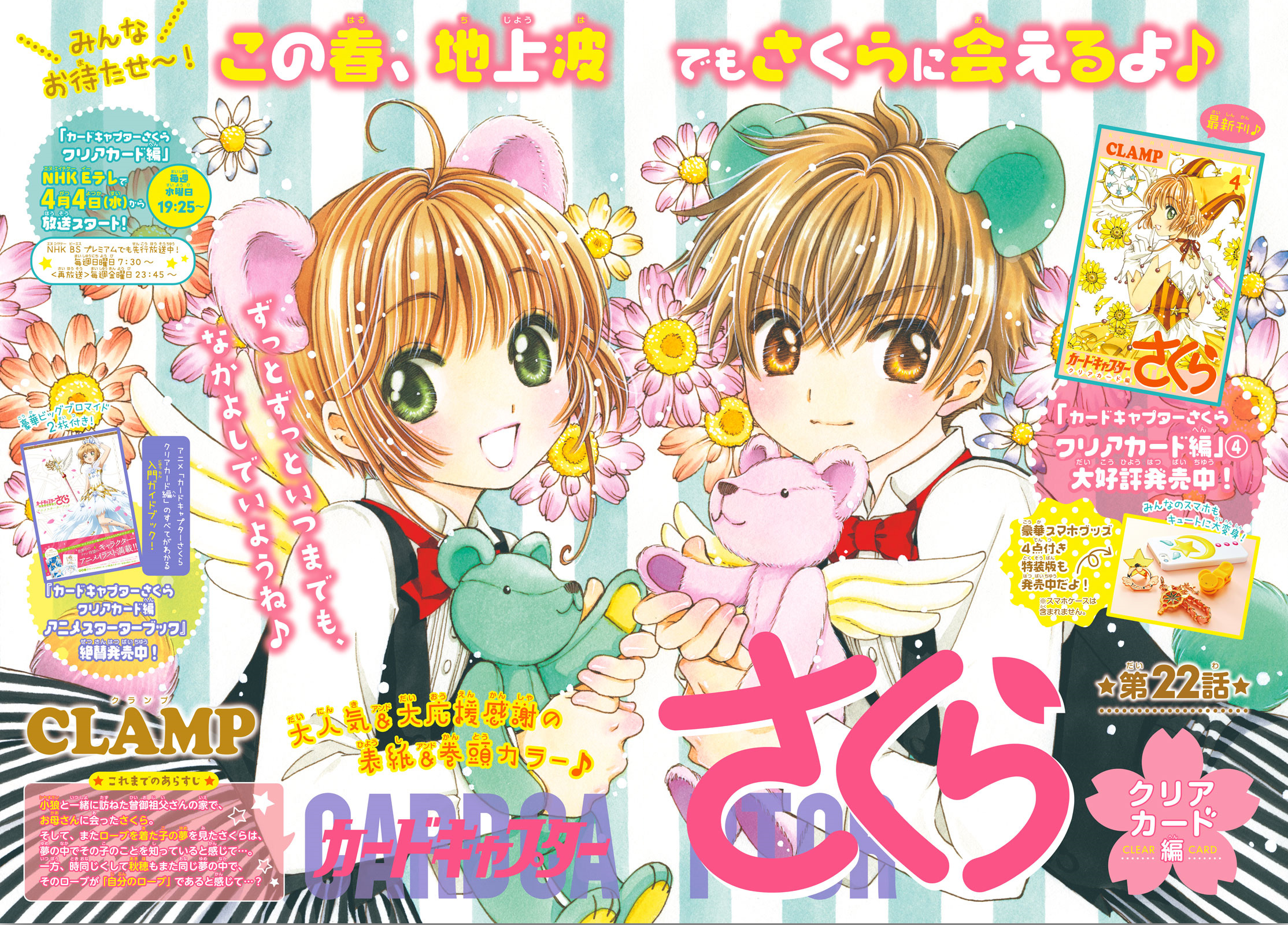 Here the long awaited double spread! After 8 months. Here we have the double spread and magazine cover to open tankoubon 5. No announcement for a movie, I guess there won’t be any for Clear Card. Or maybe if there’s another part after Clear Card.