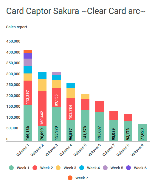 The chart below shows the progress in the sales of Card Captor Sakura ~Clear Card arc~ over the weeks and compares it with previous volumes’ performances (click on it for dynamic version):