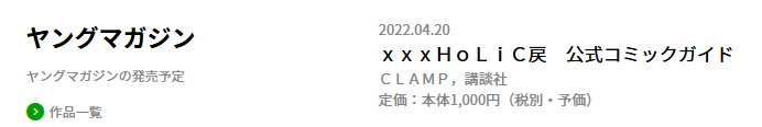 Entitled XXXHOLiC Rei Official Comic Guide (XXXHOLiC 戻 公式コミックガイド) the book will come out on April 20, costing 1000 yens.