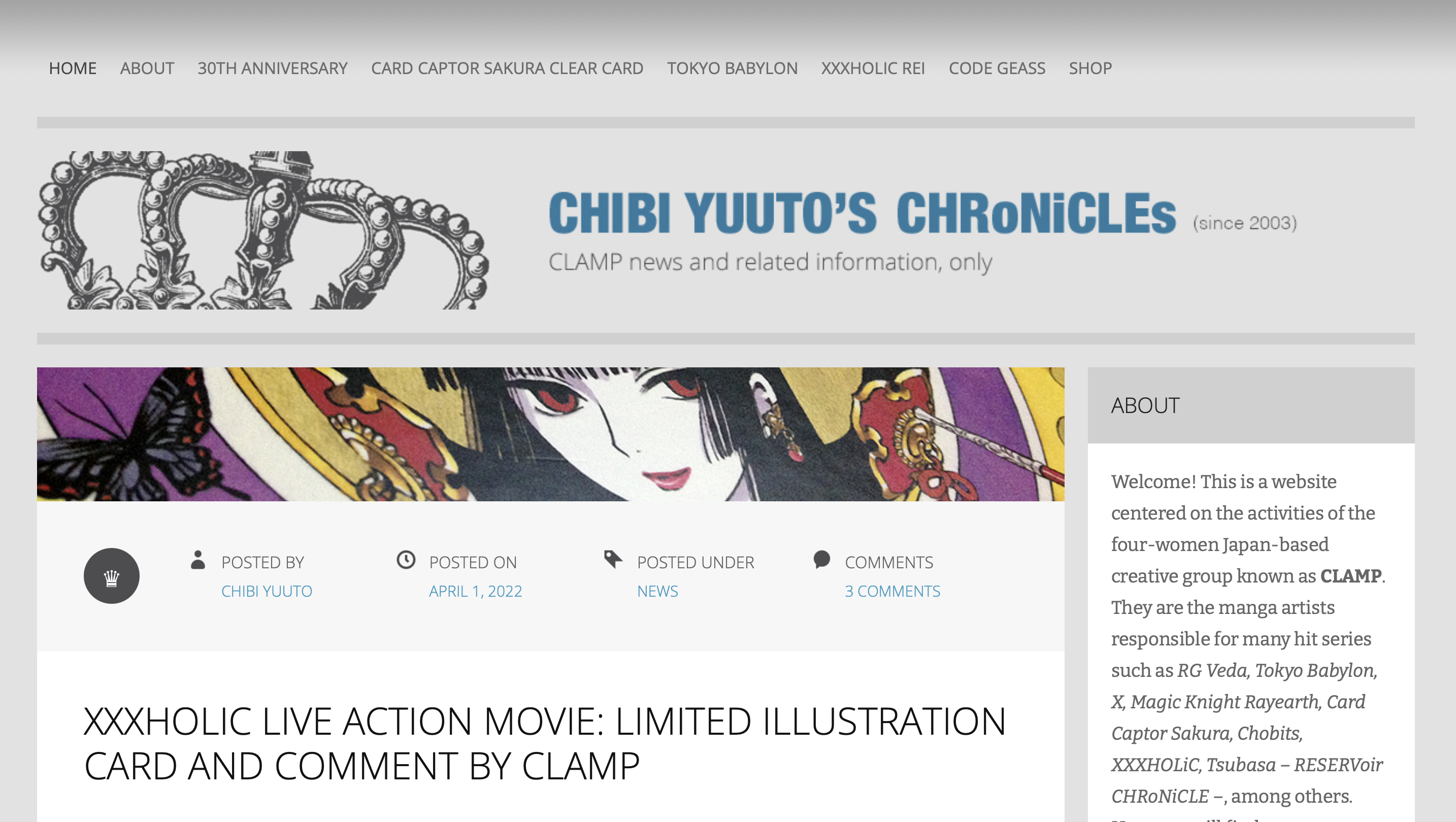 In this website you will find information concerning new releases, event reports, reviews, downloads and other related information about CLAMP and their works, including manga and derived adaptations such as animated movies, TV series, video-games, novels etc.