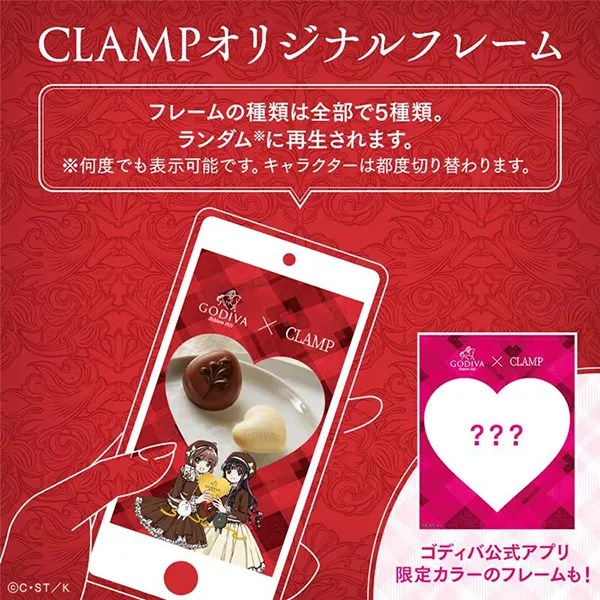 There will also be two campaigns taking place: one will offer CLAMP-themed photo frames after scanning the QR codes that come on the leaflet included with the Godiva x CLAMP Collection chocolate set (4 pieces or 8 pieces), and another will give away a special sticker (out of five different kinds) as a purchase bonus for online and in-store purchases: